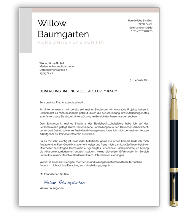 Das Bewerbungsschreiben ist der schwierigste Teil einer Bewerbung. Ein aussagekräftiges Anschreiben muss formuliert werden – das fällt vielen Bewerbern nicht leicht. Aus diesem Grund haben wir deine Vorlage für das Anschreiben bereits mit einem Mustertext gefüllt! Passe diesen ganz einfach für dich an oder überschreibe ihn mit deinem eigenen, individuellen Anschreiben. Fertig!