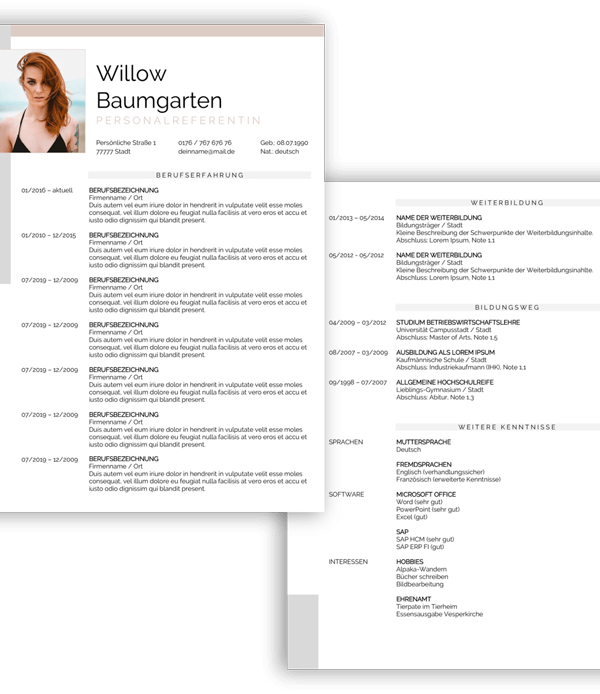 Die gängigste Form für den Lebenslauf ist ein tabellarischer Aufbau. Das heisst: die aktuellste Tätigkeit steht immer an erster Stelle. Danach folgen chronologisch absteigend alle anderen Tätigkeiten. Unsere Vorlage ist bereits tabellarisch aufgebaut. Sie beinhaltet außerdem Mustertexte und Platzhalter, unter die du nur noch deine persönlichen Daten eintragen musst. So kannst du dich besser auf die Formulierung deiner Texte konzentrieren – den Rest haben wir ja schon für dich erledigt.