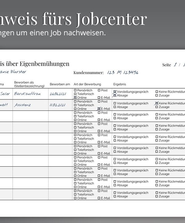 Wer arbeitslos ist und Leistungen vom Arbeitsamt bezieht, muss sich schnellstmöglich um einen neuen Job bemühen. Hierfür fordert das Arbeitsamt (Job Center / Agentur für Arbeit) meistens einen „Nachweis von Eigenbemühungen„, also dass du dich um einen neuen Job bemühst und deine Arbeitslosigkeit beendest. Hierfür musst du dem Arbeitsamt Nachweise erbringen, bei welchen Unternehmen du dich beworben hast und was aus den Bewerbungen geworden ist. Wenn es dir nicht gelingt, einen Nachweis von Eigenbemühungen um einen Arbeits- oder Ausbildungsplatz zu erbringen, drohen Leistungskürzungen. Mit unserem Nachweis fürs Arbeitsamt hast du alle Unterlagen direkt beisammen. Trage einfach jede Kontaktaufnahme zu deiner Jobsuche in die Tabelle ein und lege das Dokument beim Arbeitsamt vor. So behältst auch du einen Überblick über deine Bewerbungen.