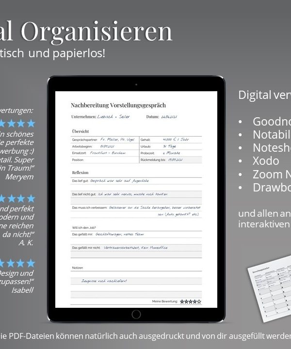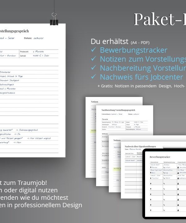 Mit unserem Job Tracker bist du im Bewerbungsprozess immer top organisiert. Behalte den Überblick über alle deine Bewerbungen, verpasse keine Termine mehr und sieh mit einem Blick, wo du noch auf eine Rückmeldung wartest! Die Dokumente einfach sofort nach der Bezahlung herunterladen, ZIP entpacken und sofort loslegen. Ob ausgedruckt oder digital auf dem iPad oder Tablet.