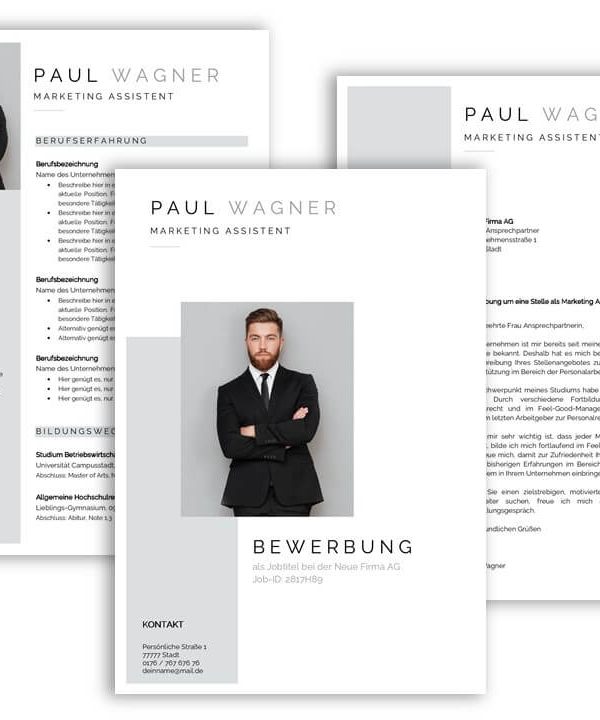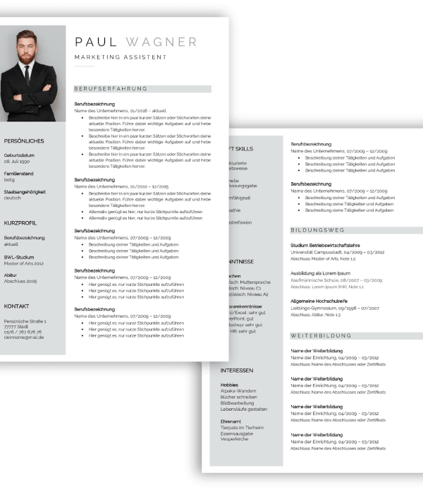 Diese Vorlage enthält alle wichtigen Unterlagen in einheitlichem Design: Lebenslauf, Deckblatt, Anschreiben / Bewerbungsschreiben und weitere Dokumente. So kannst du deinen Lebenslauf erstellen und deine Bewerbungsvorlage bearbeiten – alles in wenigen Minuten.