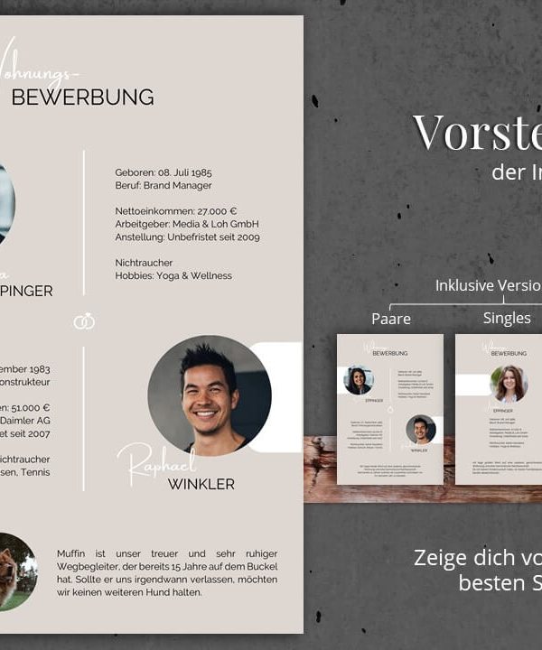 Die Wohnungsbewerbungsvorlage beinhaltet 4 verschiedene Versionen (Paar, Familie mit Kindern, Paar mit Hund, Single) und ist einfach zu bearbeiten. Jetzt Wohnungsbewerbungs-Vorlage kaufen!